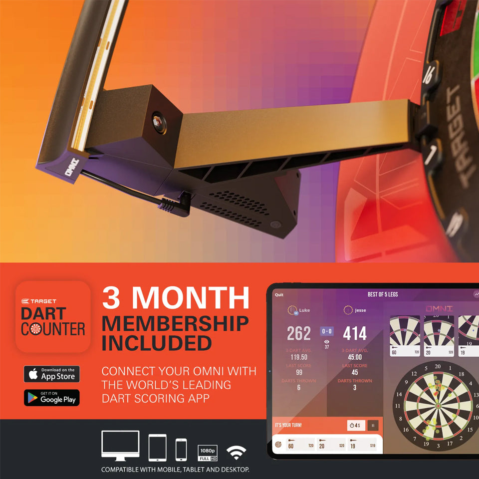 Take your game further with 3 months of DartCounter Ultimate included. Access advanced statistics, finish calculators, and the exclusive integration with Omni Auto Scoring. Challenge friends online, monitor your progress & make every throw count.