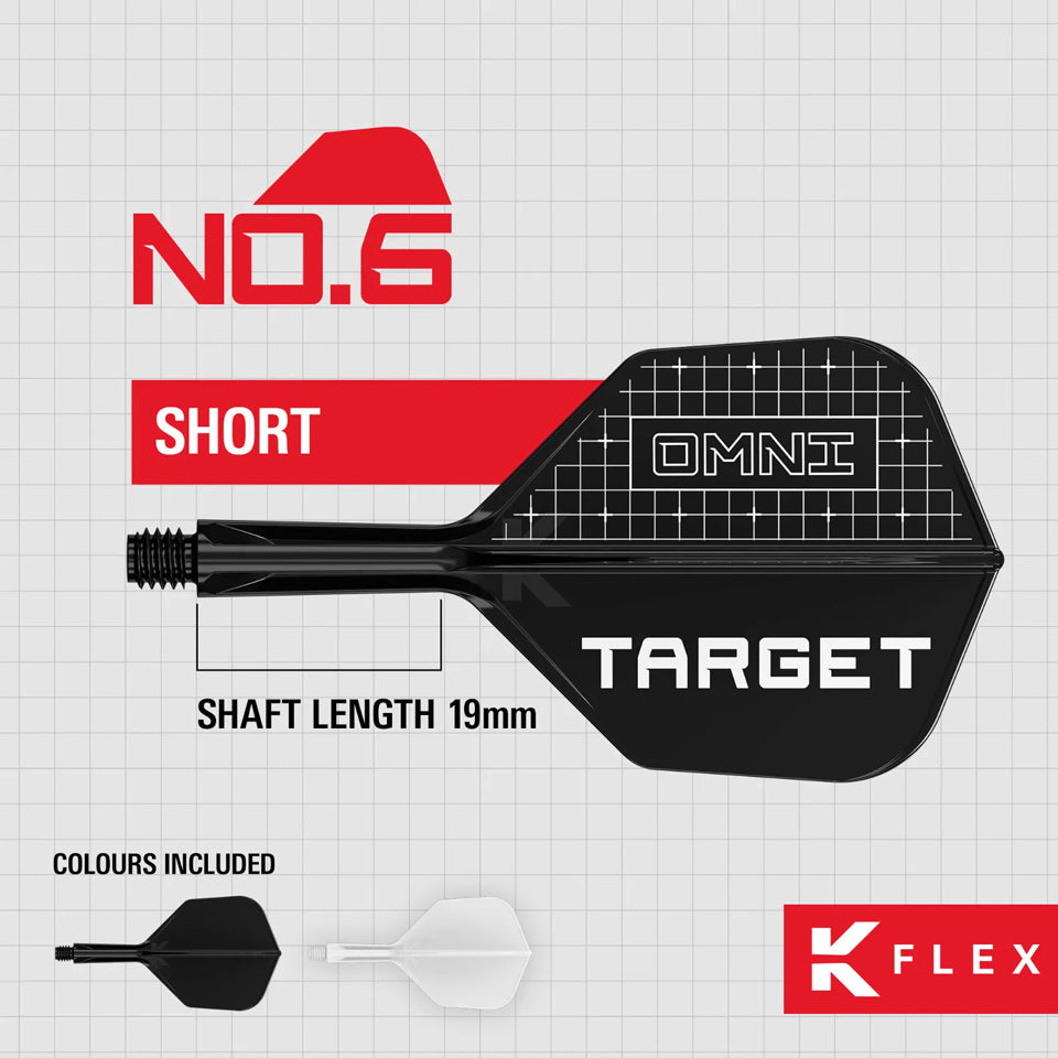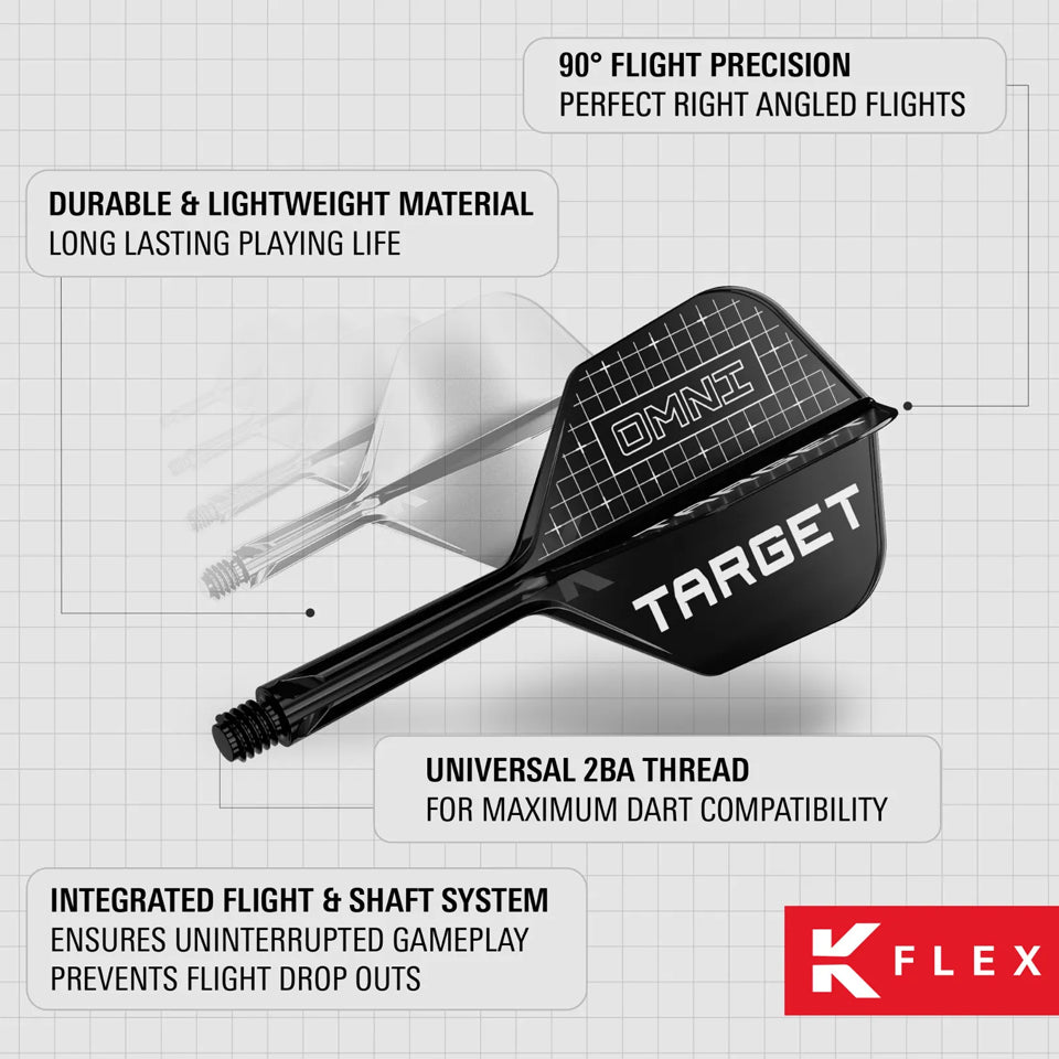 This bundle includes 6 K-Flex No.6 systems (3x black, 3x white), exclusively branded with the Omni logo. Crafted with injection molding technology, these one-piece flights & shafts eliminate pop-outs and maintain a fixed 90° angle for consistent aerodynamics, reduced deflections & tighter groupings.
