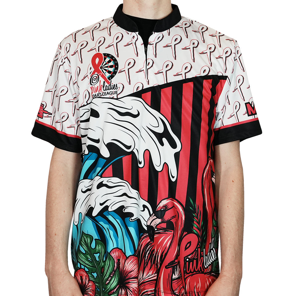 Officially licensed Pink Ladies Dart League Flamingo Jersey (in conjunction with NDA Team Dart Pink Ladies Event 2025). A portion of sales go directly back to the Pink Ladies Dart League Organization to help spread awareness for the breast cancer cause they represent.