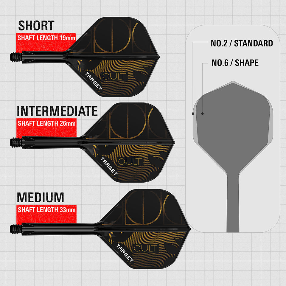 The Cult edition K-Flex integrated dart flights and shafts are designed as the perfect complement to the Cult dart series. Finished in sleek black with gold detailing, the featuring the bold, elegant Cult logo and abstract line work inspired by the dart range design.